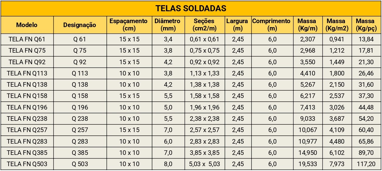Telas de aço compostas por fios eletrossoldados em forma de malha, fabricadas conforme NBR 7481 utilizam vergalhões nervurados FN6O0(CA6O) certificados, proporcionando maior confiabilidade da estrutura. Ideais para lajes, estruturas pré-moldadas, pisos industriais, paredes de concreto, entre outras diversas aplicações. São fornecidas em fardos de 50 unidades e comprimento padrão de 6 m.